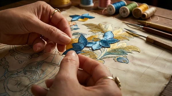 Materials: Silk/cotton cut & embroidered, natural mineral dyes for rich, layered colors (hallmark of barbola)