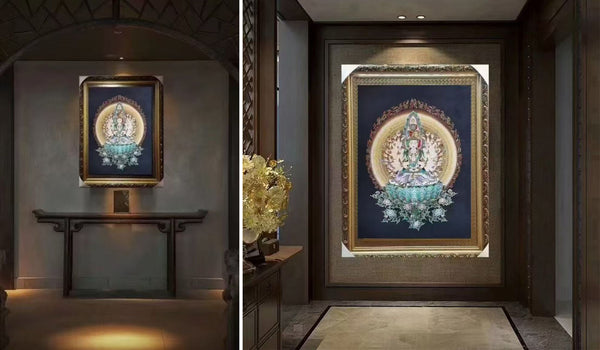 Jambhala, also known as Kubera, is revered as the god of wealth in Tibetan Buddhism. He is believed to be an emanation of Avalokiteshvara (Chenrezig), the Bodhisattva of Compassion. As a symbol of abundance and prosperity, it is believed that keeping a painting or statue of Jambhala in your home brings blessings of wealth and financial well-being.