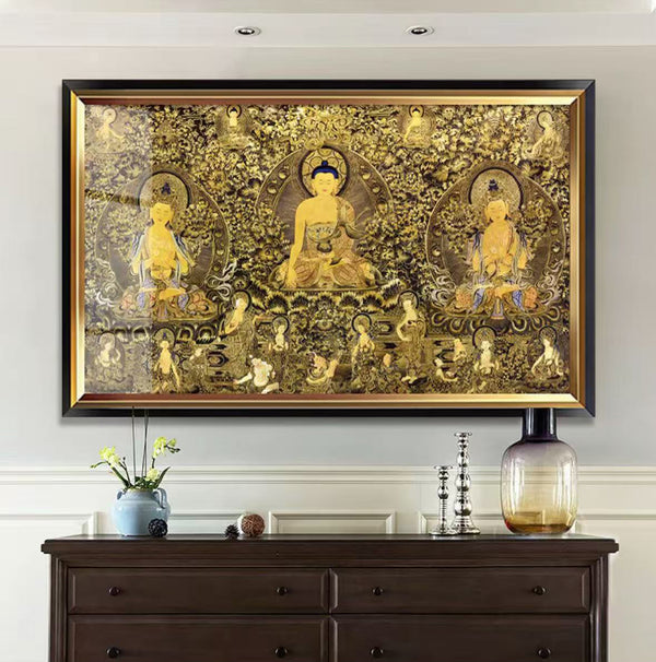 Filigree Thangka Thangka, pioneered in Qinghai in the early 21st century, is a derivative art form of traditional Thangka that incorporates cloisonné techniques. This craft involves outlining designs with metal wires (such as copper or gold foil wires) on a base board, which are then filled with natural mineral or plant-based pigments to create vivid, textured visuals. It represents a fusion and continuation of two intangible cultural heritages: Thangka art and Filigre craftsmanship.